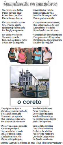 Lembro que pela efeméride açoriana religiosa, o mesmo que dizer, os 150 anos da freguesia da Serreta (em 2012) fui autora de algumas quadras a pedido da comissão da festa. Uma delas com destino aos carros alegóricos do Bodo de Leite, da terça-feira, rezava assim: